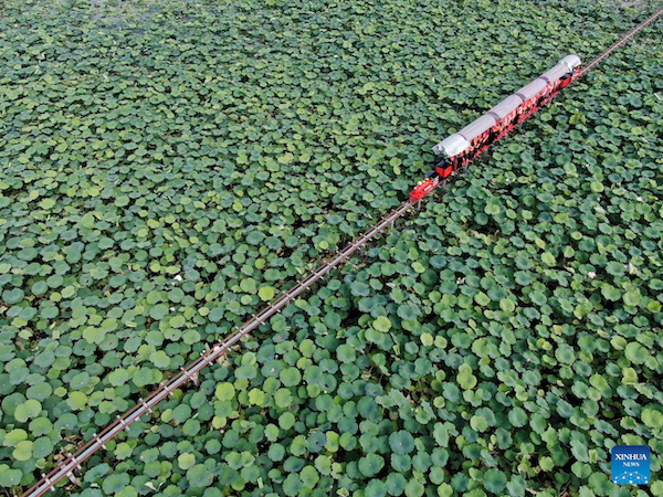Στι? παρακ?τω αεροφωτογραφ?ε? που τραβ?χτηκαν στι? 2 Ιουλ?ου 2022 μπορο?με να δο?με επισκ?πτε? να πα?ρνουν ?να τρεν?κι για περι?γηση στα αξιοθ?ατα για να απολα?σουν τα νο?φαρα τη? λ?μνη? Λονγκντ? στην π?λη Τζινχ?νγκ τη? αυτ?νομη? περιοχ?? Σισουανμπαν? Ντ?ι, στην επαρχ?α Γιουν?ν τη? νοτιοδυτικ?? Κ?να?. (Φωτογραφ?α/Xinhua)