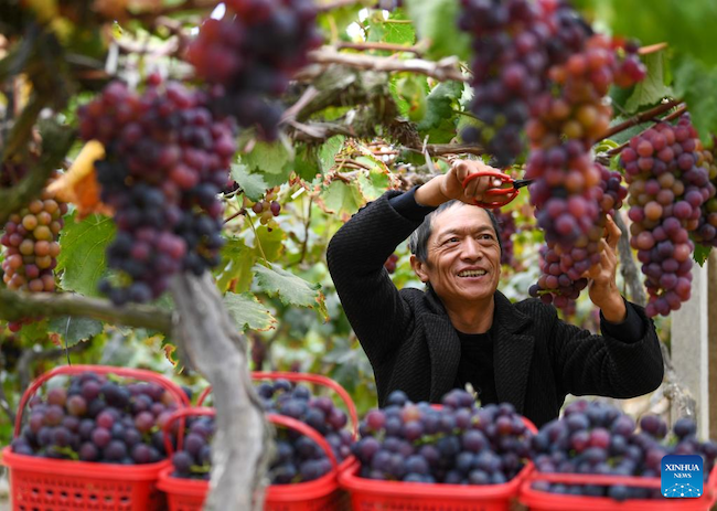 ?να? χωρικ?? συγκομ?ζει σταφ?λια στην κωμ?π?λη Σανκεσο? τη? π?λη? Κα?λ?, στην επαρχ?α Γκουε?τζ?ου τη? νοτιοδυτικ?? Κ?να?, 10 Οκτωβρ?ου 2022. (Φωτογραφ?α: Cai Xingwen/Xinhua)