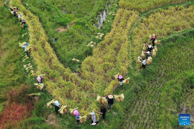 Οι χωρικο? συγκομ?ζουν ρ?ζι στην κωμ?πολη Μπινγκμ?ι τη? κομητε?α? Τσονγκτζι?νγκ, στην επαρχ?α Γκουε?τζ?ου τη? νοτιοδυτικ?? Κ?να?, 10 Οκτωβρ?ου 2022. (Φωτογραφ?α: Wu Dejun/Xinhua)