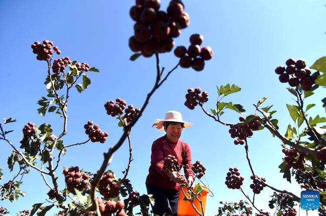 ?να? χωρικ?? μαζε?ει φρο?τα κρατα?γου? στην κωμ?πολη Γιουετζου?νγκ τη? κομητε?α? Γιγιου?ν στην π?λη Τζιμπ?, στην επαρχ?α Σαντ?νγκ τη? ανατολικ?? Κ?να?, 10 Οκτωβρ?ου 2022. (Φωτογραφ?α: Zhao Dongshan/Xinhua)