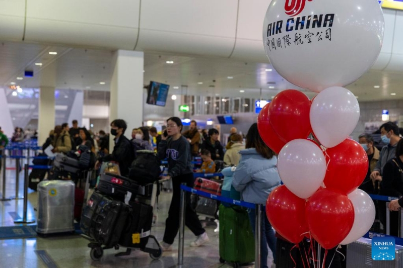 Οι επιβ?τε? περιμ?νουν να κ?νουν check-in για την πρ?τη απευθε?α? πτ?ση μεταξ? Σαγκ?η? και Αθ?να? στον Διεθν? Αερολιμ?να Αθην?ν, Ελλ?δα, στι? 22 Δεκεμβρ?ου 2022. (Xinhua/Marios Lolos)
