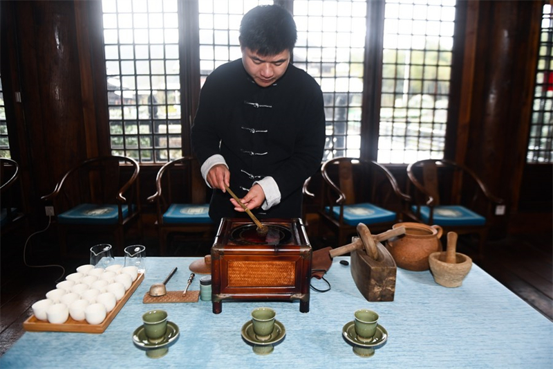 Ο Λιν Γουιγι?νγκ, κληρον?μο? των τεχνικ?ν παρασκευ?? τσαγιο? Ζισο?ν, βρ?ζει τσ?ι με παραδοσιακ? τρ?πο στην κομητε?α Τσανγκσ?νγκ, στην επαρχ?α Τζετζι?νγκ τη? ανατολικ?? Κ?να?, 30 Νοεμβρ?ου 2022. (Xinhua/Xu Yu)