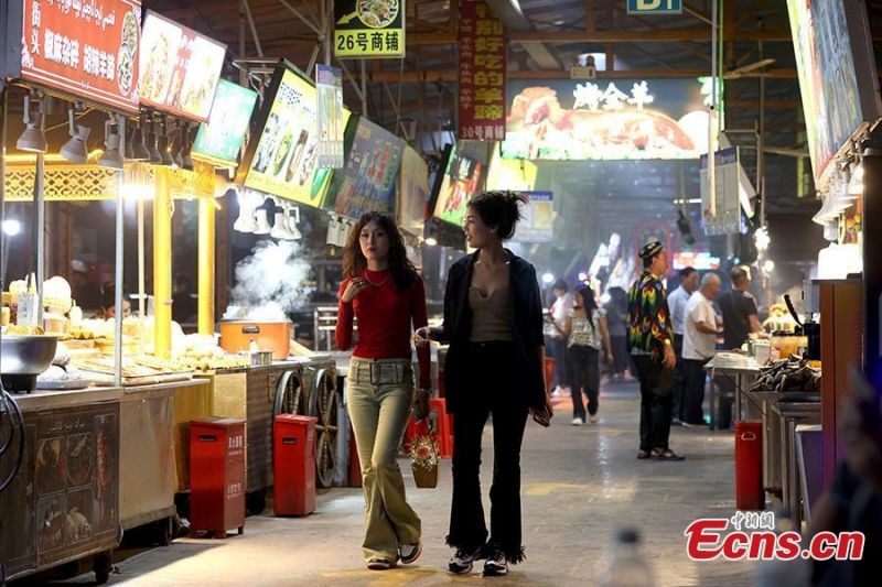 Δυο κορ?τσια περιηγο?νται στο νυχτεριν? παζ?ρι του Ακσο?, στην Αυτ?νομη Περιοχ? Σιντζι?νγκ Ουιγκο?ρ τη? δυτικ?? Κ?να?, στι? 4 Σεπτεμβρ?ου του 2023.