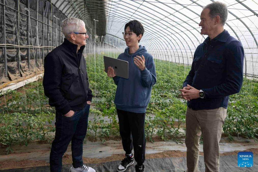 Η Shen Xinyi (κ?ντρο), φοιτ?τρια στο Πανεπιστ?μιο Zhejiang, παρουσι?ζει ?ναν ?αγρ? επιστ?μη? και τεχνολογ?α?? στον Tim Cook (αριστερ?) και στον Jeff Williams, COO τη? Apple, σε ?να βιολογικ? αγρ?κτημα στην Περιοχ? Shunyi, Πεκ?νο, 22/10/2024.