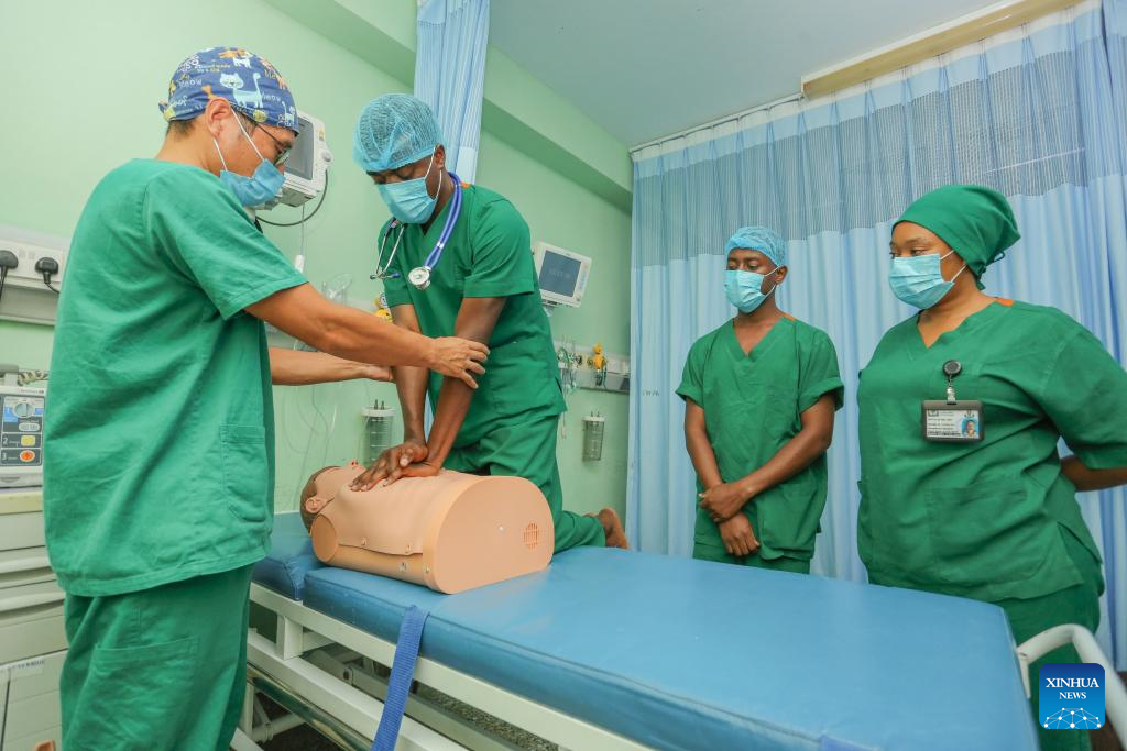 Ο Ζανγκ Τζουνκι?ο δ?νει οδηγ?ε? στι? τοπικ?? νοσοκ?με? τη? Τανζαν?α? να μ?θουν γν?σει? πρ?των βοηθει?ν. (Φωτογραφ?α / Xinhua)