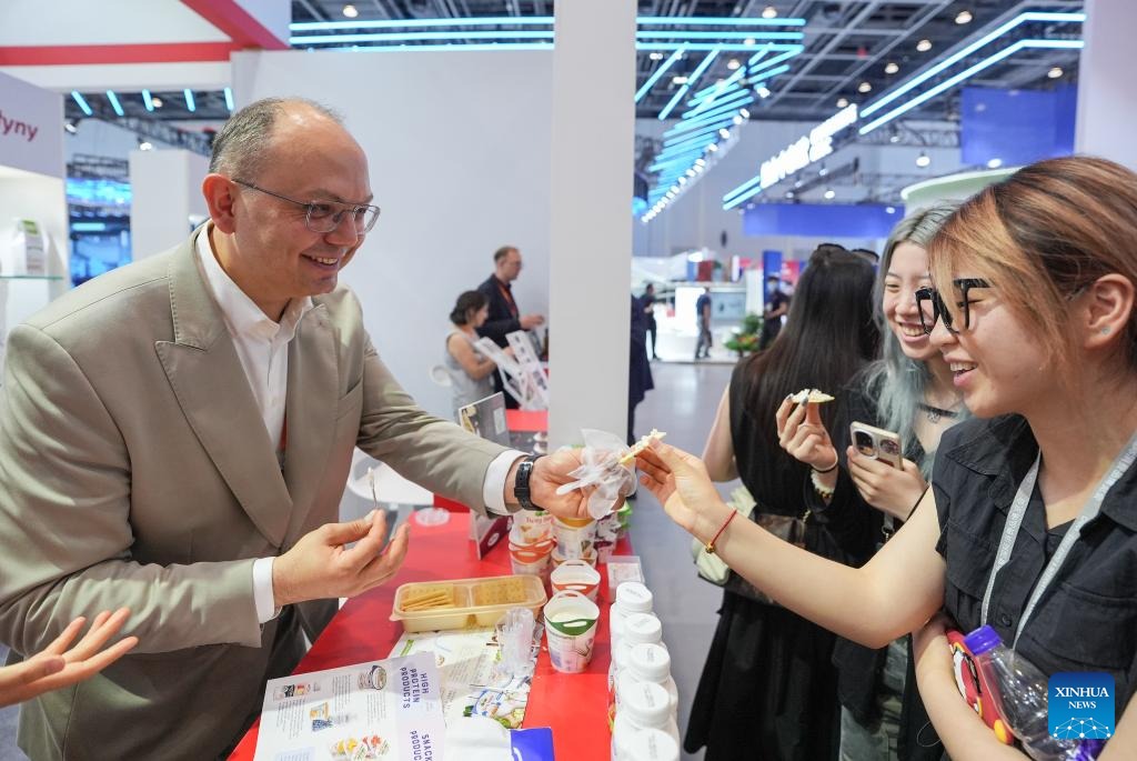 ?να? Πολων?? ?μπορο? προωθε? το τυρ? του στου? επισκ?πτε? κατ? τη δι?ρκεια τη? 4η? ?κθεση? Κ?να?-ΧΚΑΕ και Διεθνο?? ?κθεση? Καταναλωτικ?ν Αγαθ?ν στην π?λη Ν?νγκμπο, τη? επαρχ?α? Τζετζι?νγκ, στην ανατολικ? Κ?να, στι? 22 Μα?ου του 2025.