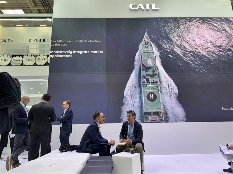This photo taken with a mobile phone on May 7, 2025 shows people visiting the booth of Contemporary Amperex Technology Co., Ltd. (CATL) during 2025 Intersolar Europe exhibition in Munich, Germany. (Φωτογραφ?α / Xinhua)