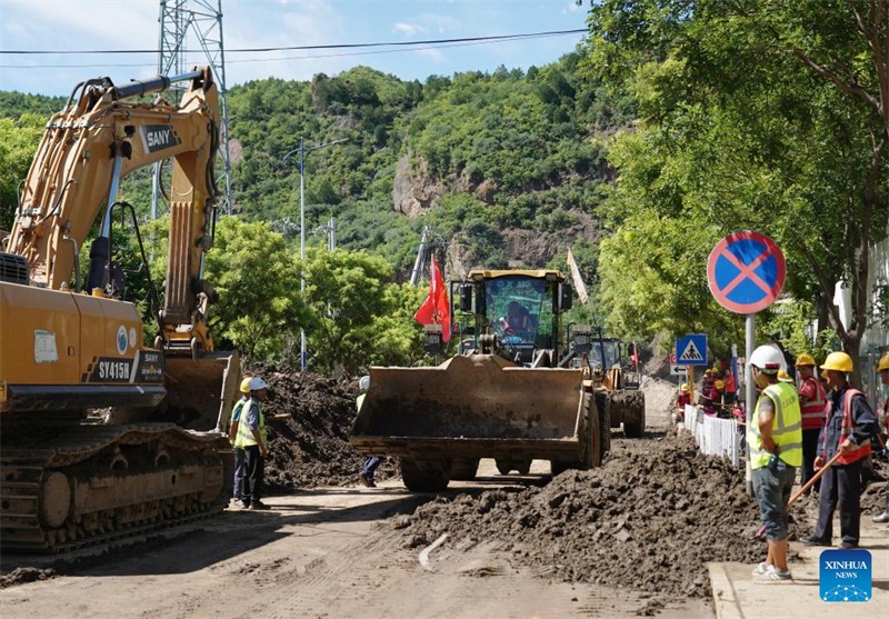 Διασ?στε? καθαρ?ζουν τη λ?σπη σε ?ναν δρ?μο στην κωμ?πολη Λιοουλιμι?ο τη? περιοχ?? Χουα?ρ?ου, στο Πεκ?νο, στι? 30 Ιουλ?ου του 2025.