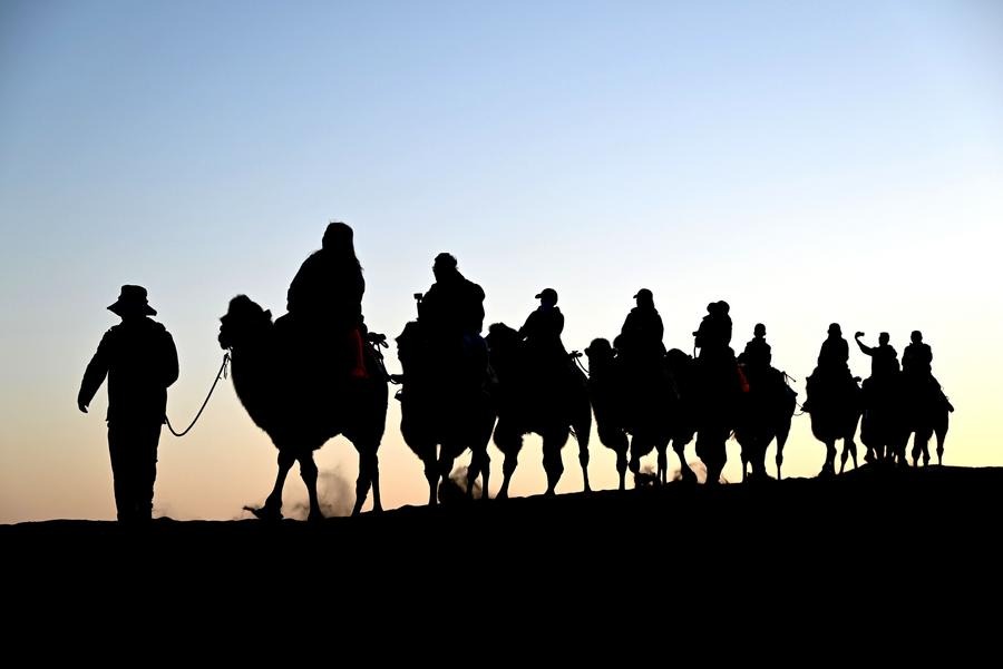 ?νθρωποι καβαλο?ν καμ?λε? στην γραφικ? περιοχ? Crescent Spring και Mingsha Sand Dune στο Ντουνχου?νγκ, στην επαρχ?α Γκανσο? τη? βορειοδυτικ?? Κ?να?, 1 Οκτωβρ?ου 2025. (Φωτογραφ?α: Zhang Xiaoliang/Xinhua)